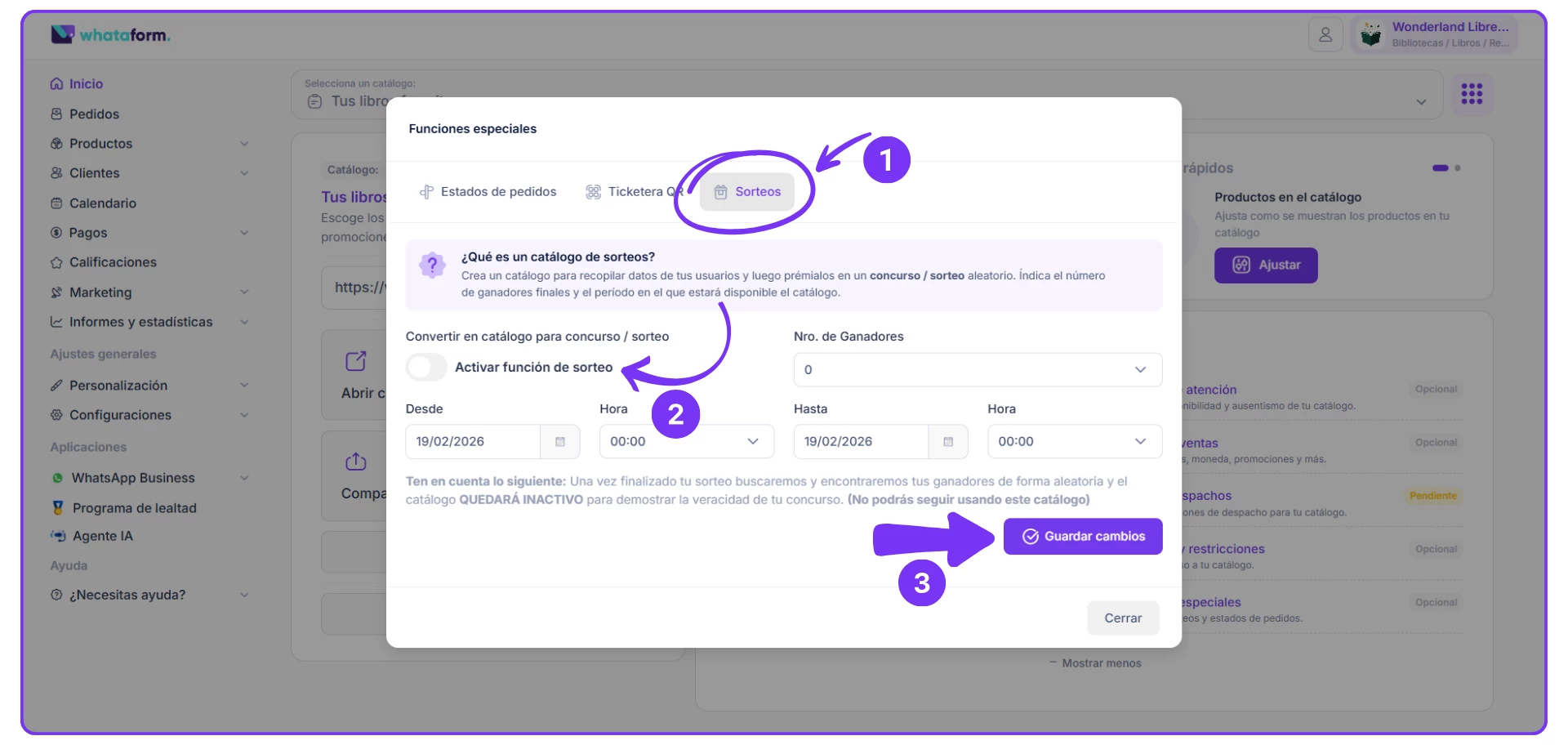 3. ACTIVA LA FUNCIÓN DE SORTEO, indica el NÚMERO DE GANADORES, Y DESDE CUANDO HASTA CUANDO ESTARÁ DISPONIBLE E IGUALMENTE LA HORA QUE EMPIEZA Y TERMINA. Y por último GUARDAR CAMBIOS.