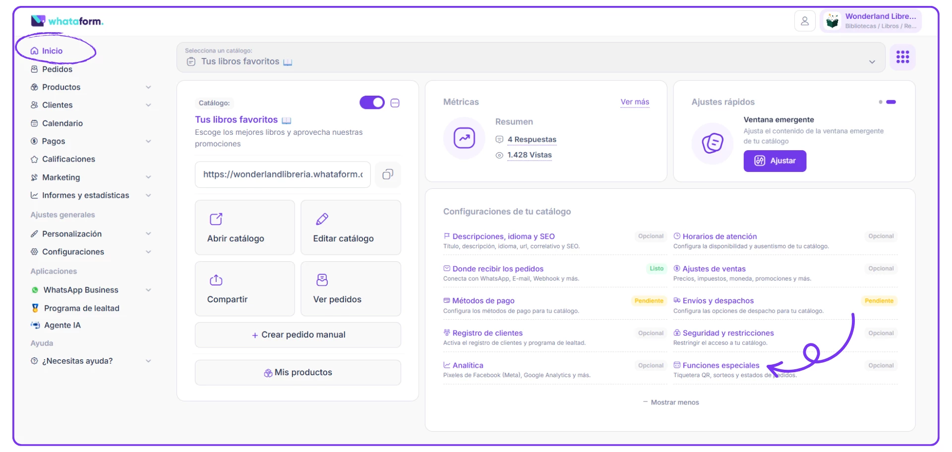 1. Desde la página de Inicio vas a encontrar la sección de Configuraciones de tu catálogo, el punto de tu interés es Funciones especiales, haces clic aquí.