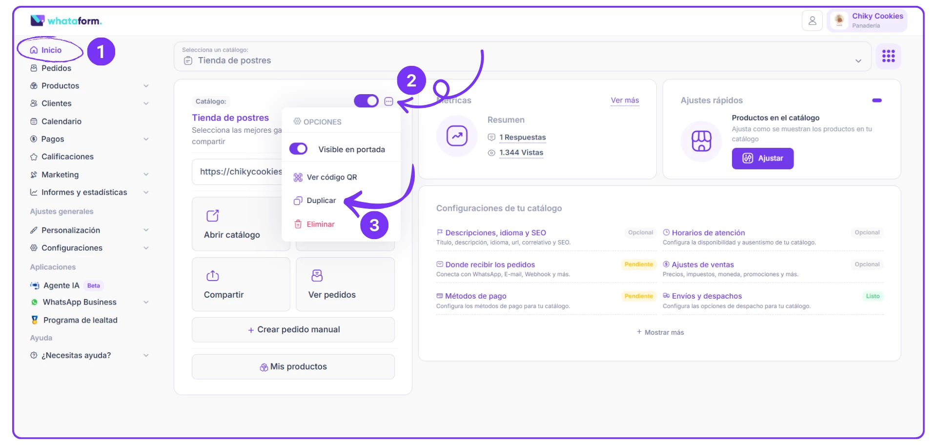 2. En el menú izquierdo vas a dar clic en Inicio… Allí encontrarás el catálogo con tres puntos en la parte superior; debes dar clic y luego seleccionar la opción DUPLICAR.