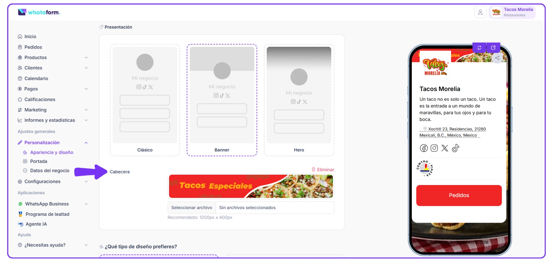 1. La imagen de fondo (Max. 2 MB - Recomendado: 3125px x 2048px) estas opciones las encontrarás en la sección Personalización en Apariencia y Diseño.