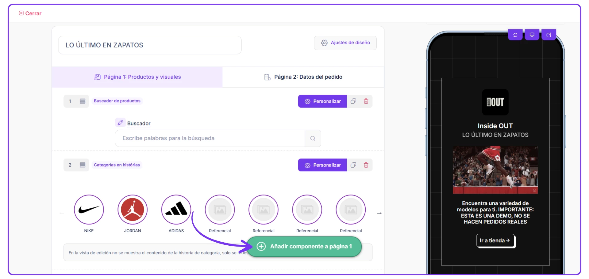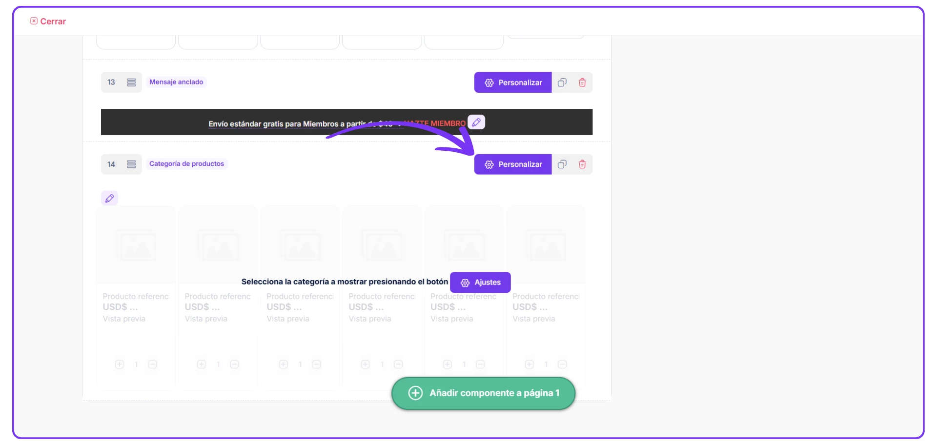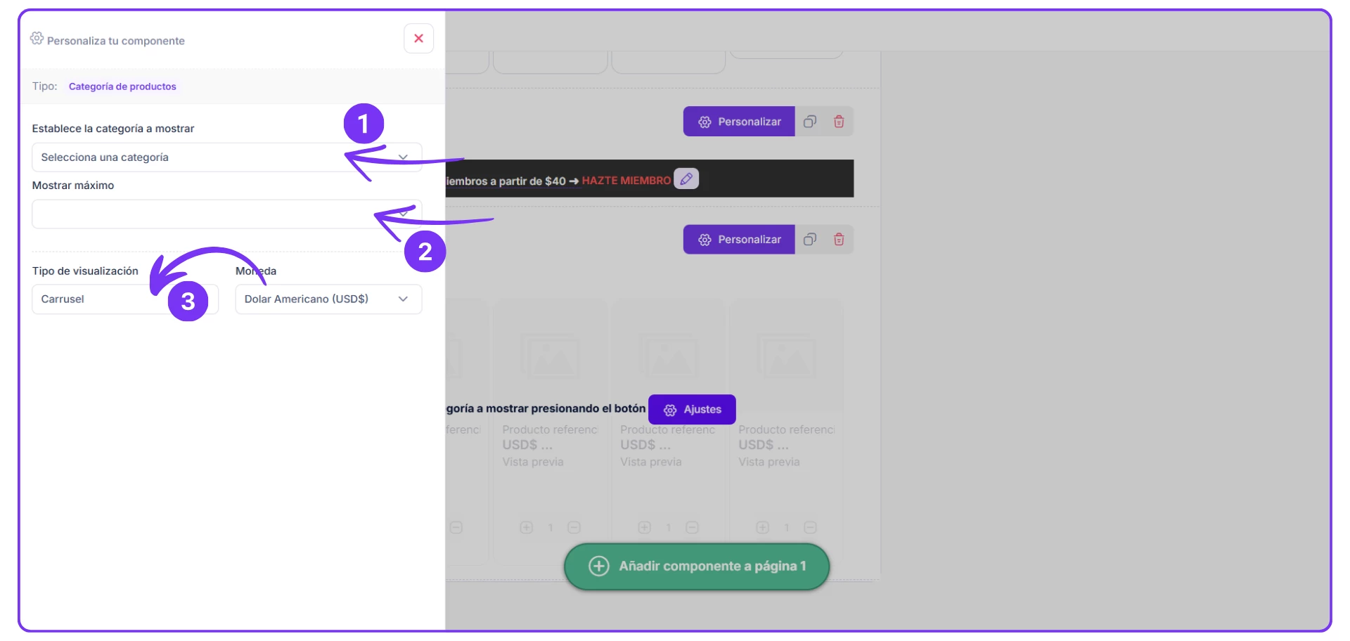 4. Del lado derecho encontrarás un campo de PERSONALIZAR, donde estarán todas las categorías que creaste en el baúl de producto; debes seleccionar cuál quieres que se visualice en ese componente, el número de productos que quieres que se vea y el tipo de visualización.