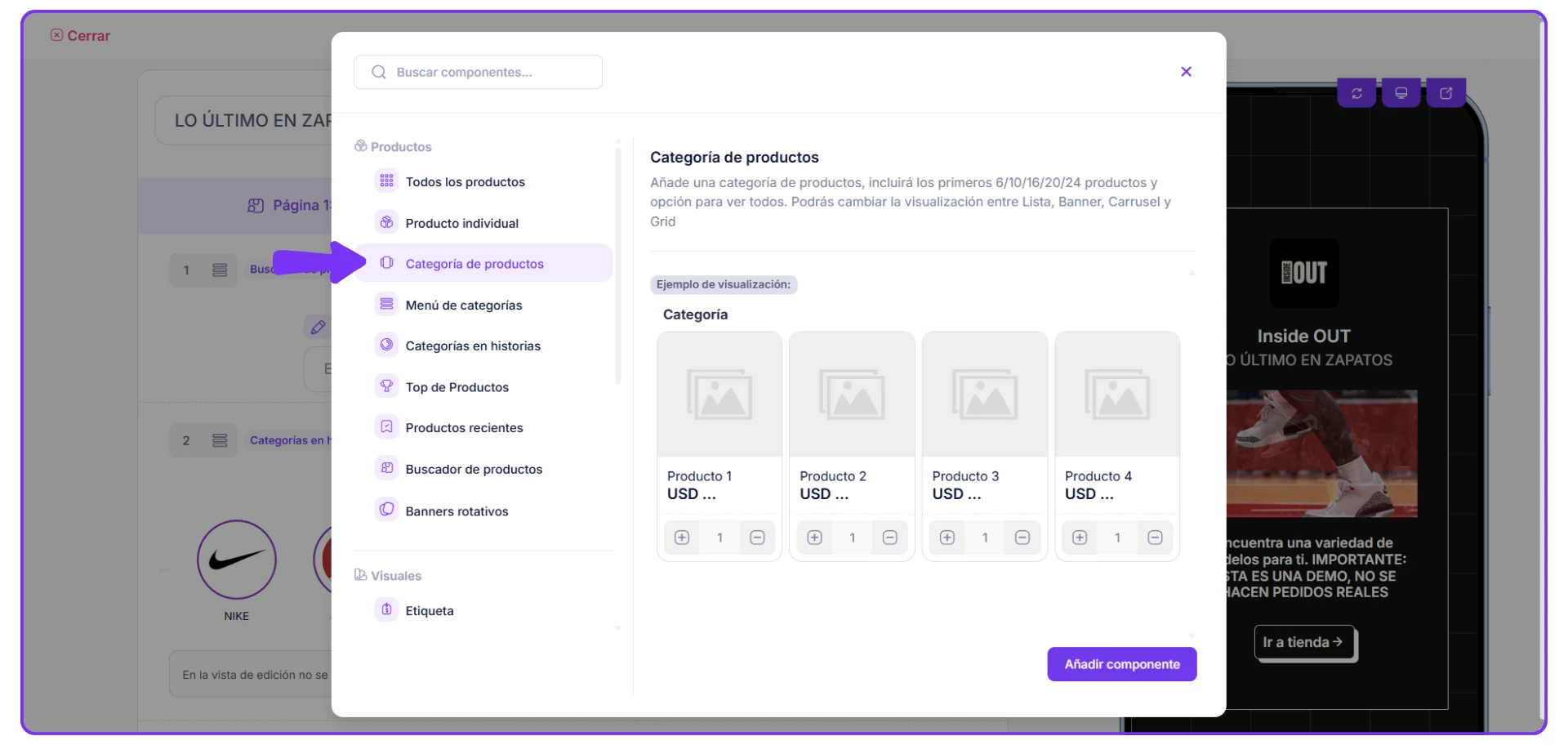 3. Aparecerán todos los componentes y vas a buscar el de CATEGORÍA DE PRODUCTOS (Seleccionas y luego das clic en Añadir componente)