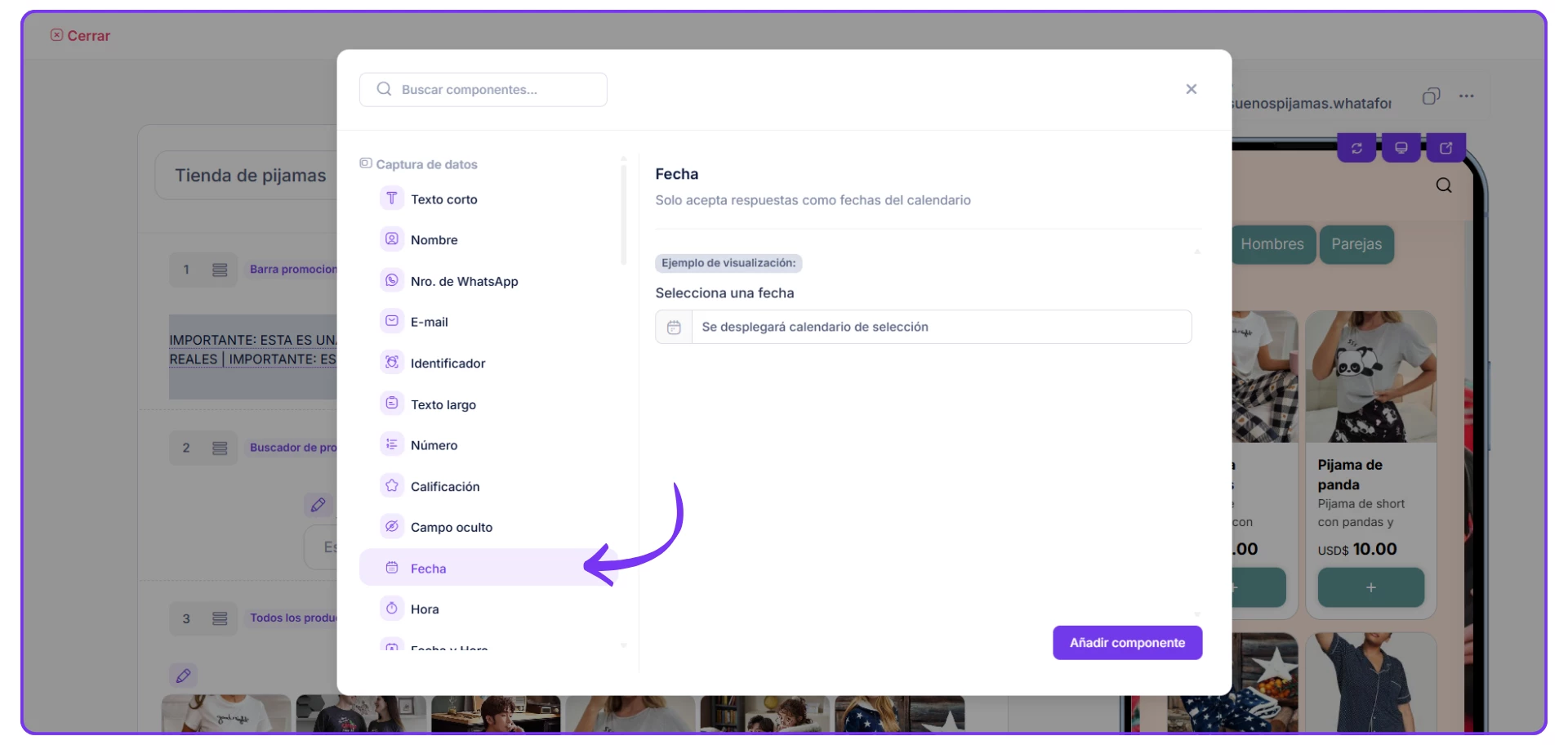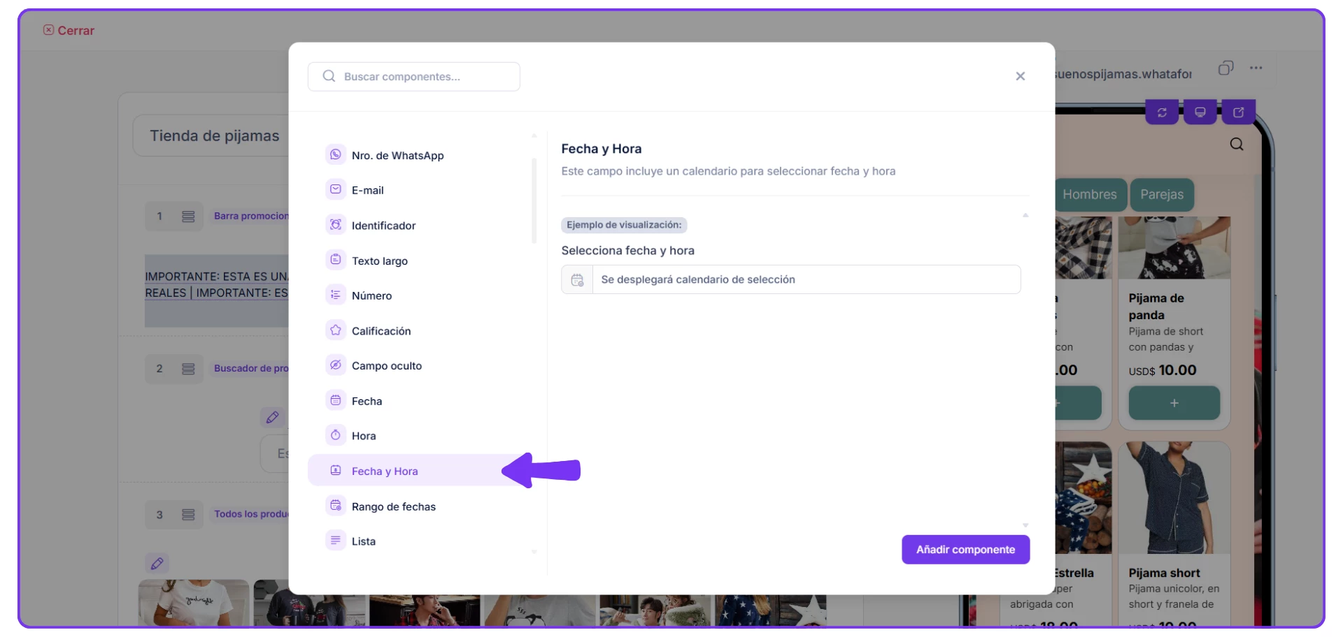 2. Das clic en Añadir componentes y conseguirás diferentes campos, pero el siguiente paso depende de lo que quieras agregar a tu catálogo, ya sea FECHA, HORA, FECHA Y HORA.