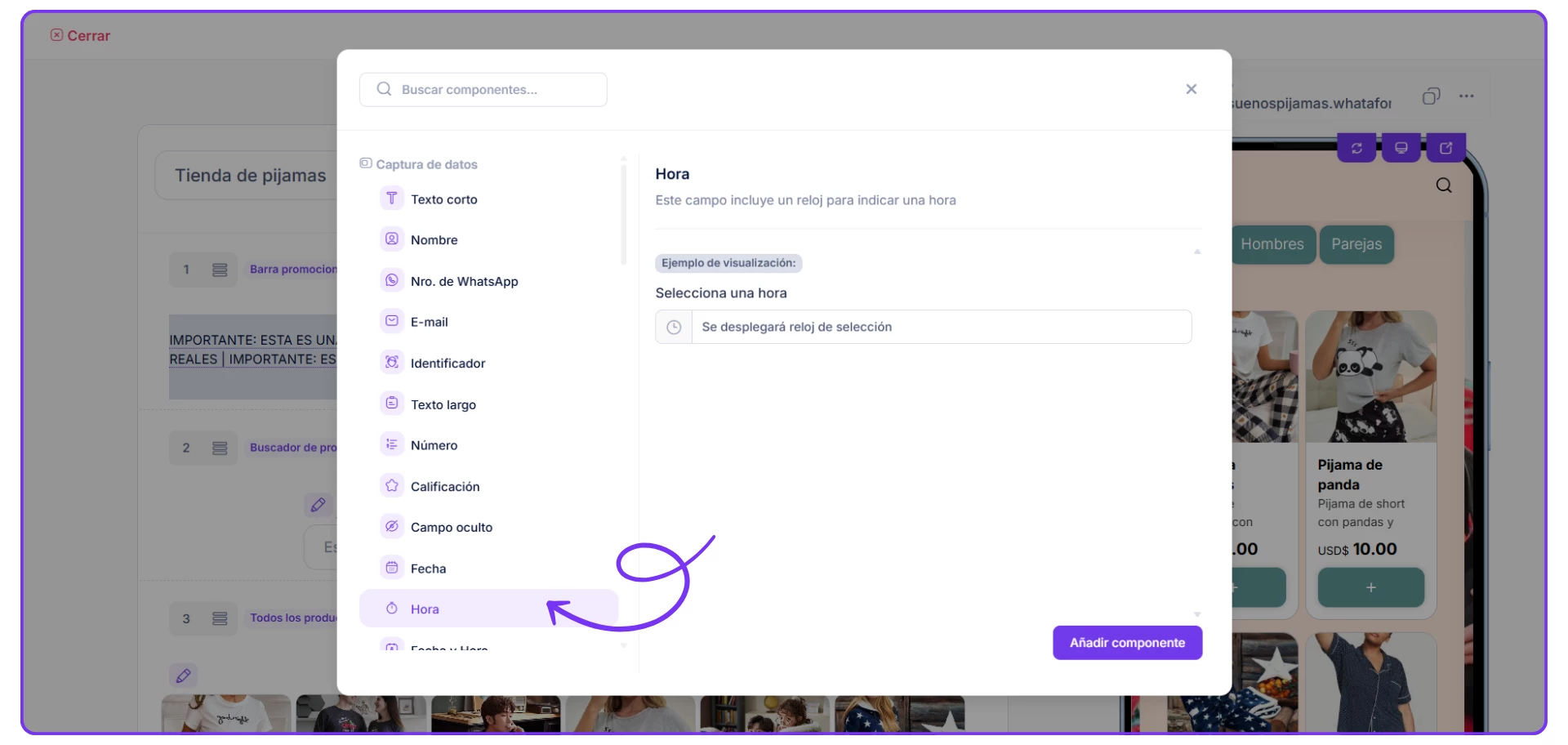 Opciones o campos de tiempo en tu página Whataform