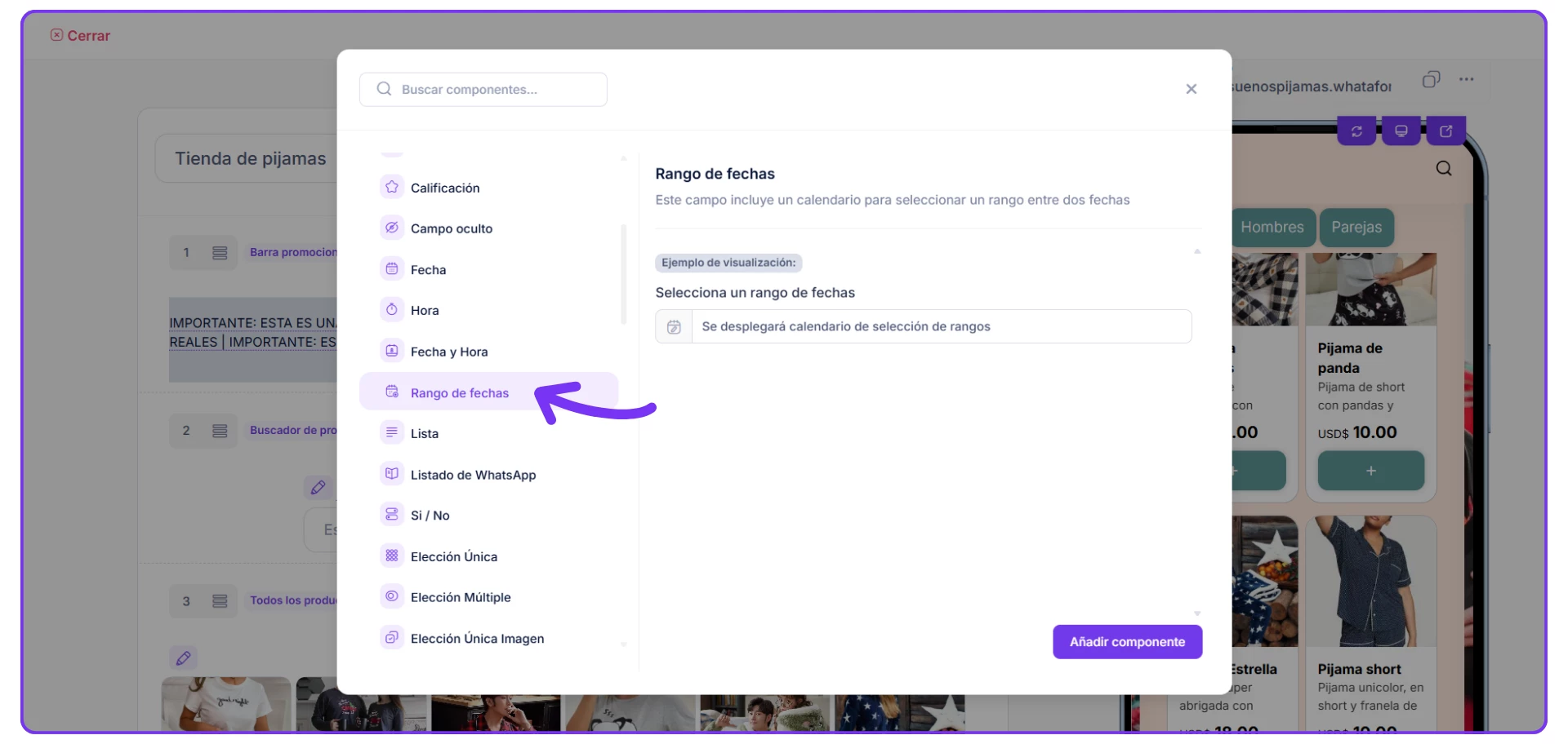 1. Ingresas a Editar catálogo, al dar clic en Añadir Componentes, encontrarás diferentes campos; haces clic en RANGO DE FECHAS.