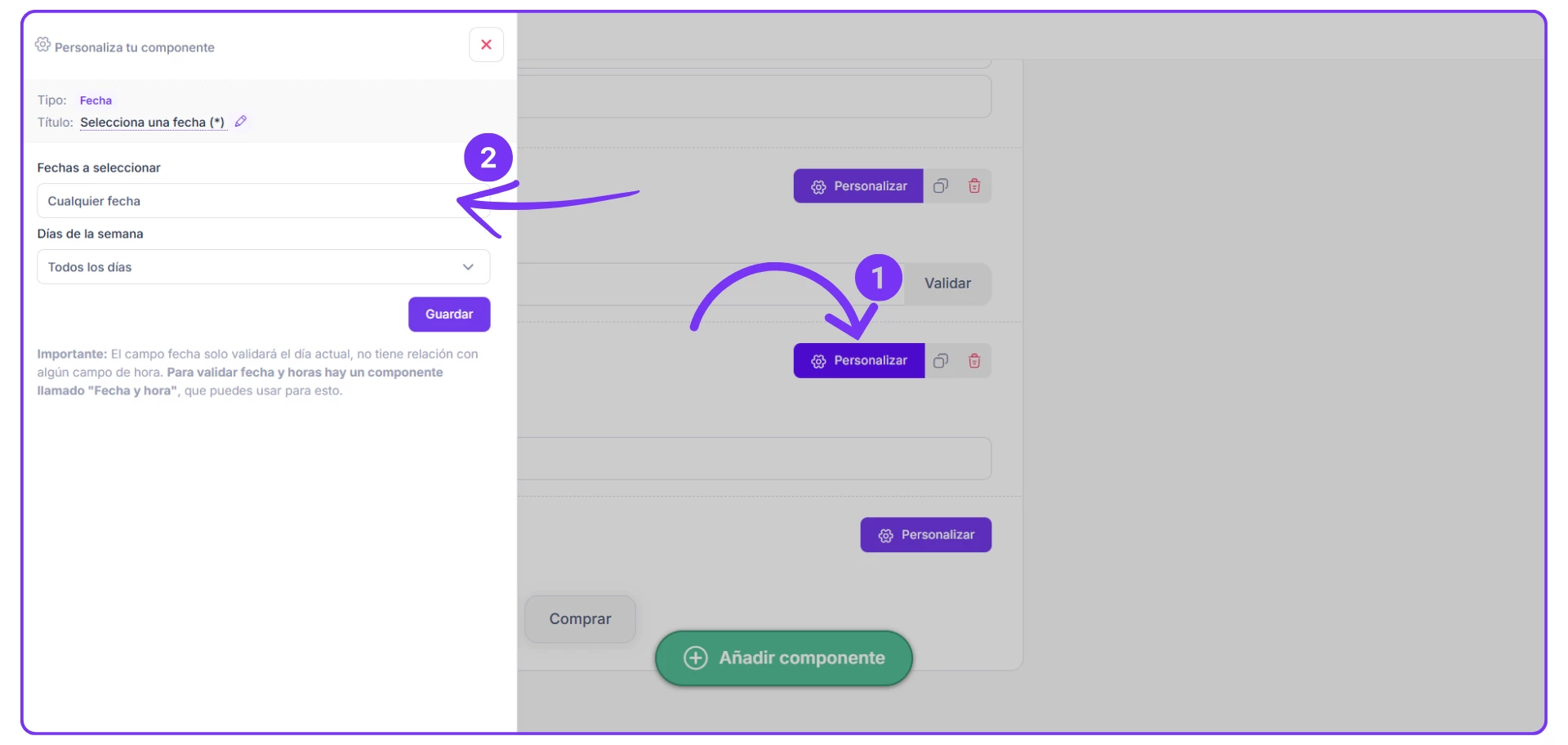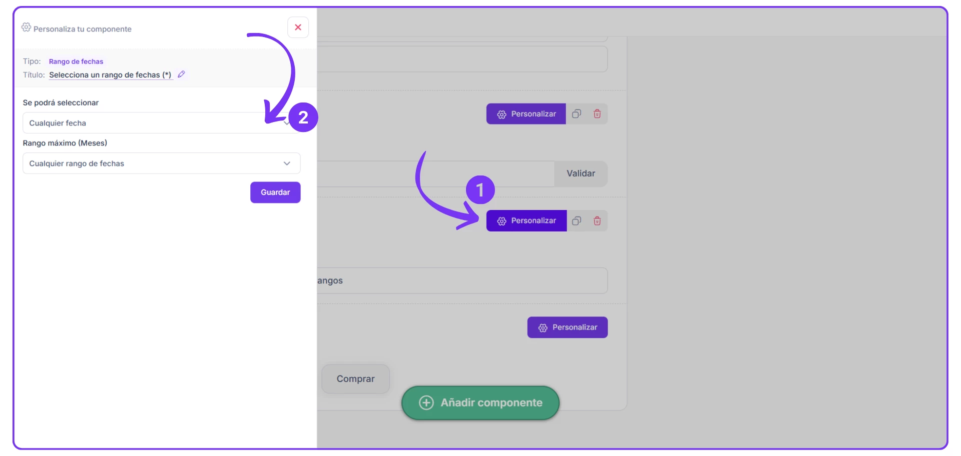 2. Luego de añadir el componente, haces clic en PERSONALIZAR y encuentras dos campos los cuales debes modificar según el rango de fecha que quieras recibir las solicitudes.