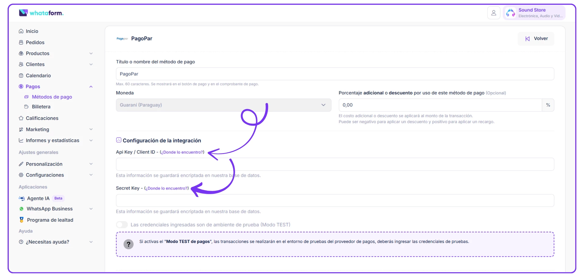 NOTA: La opción TEST de Whataform con PagoPar no está habilitada para funcionamiento, únicamente el modo PRODUCTIVO.