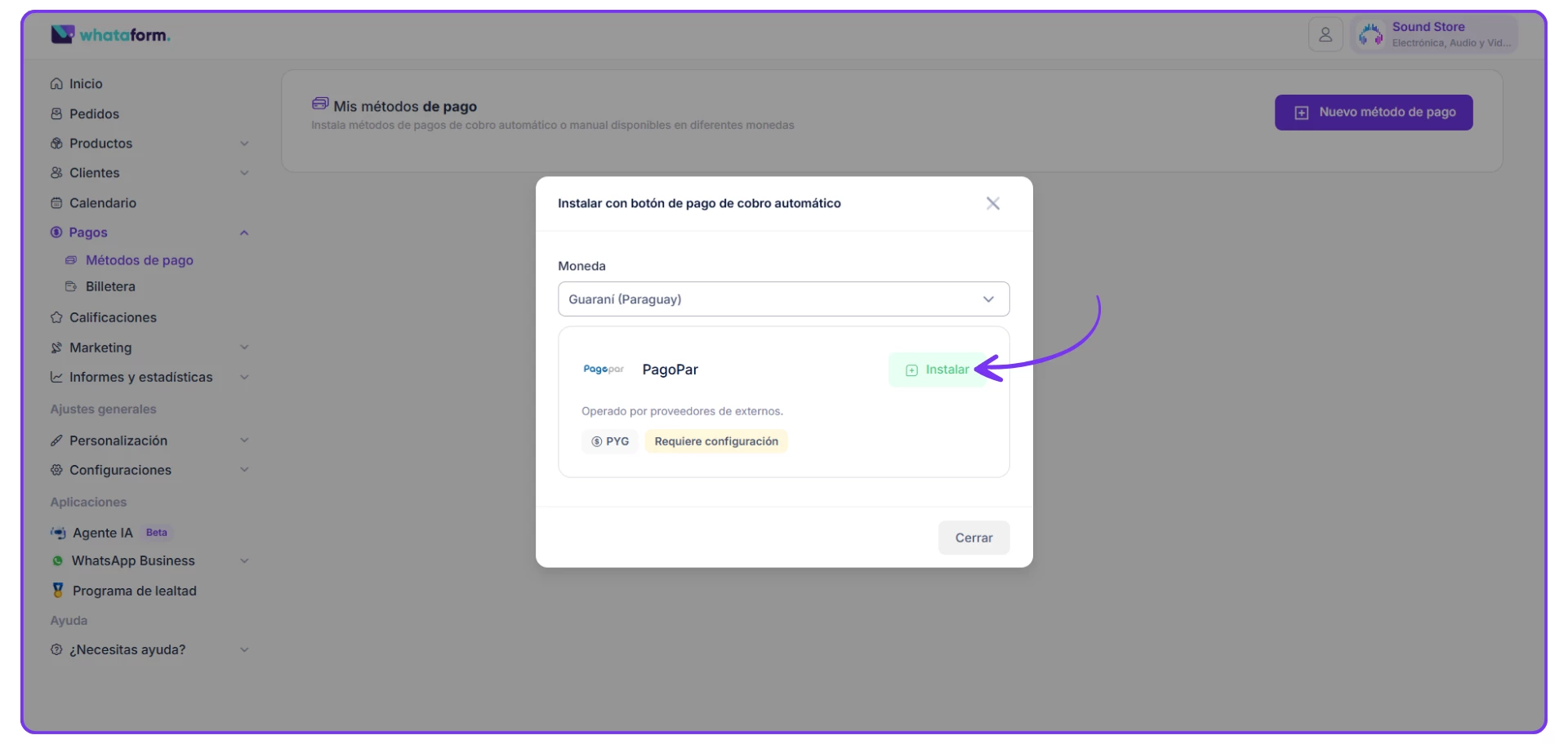 7) Y listo, la configuración de Whataform está completa, ahora solo falta terminar de configurar Pagopar. Para eso dirígete a pagopar.com, en el menú lateral y selecciona Integrar con mi sitio web.