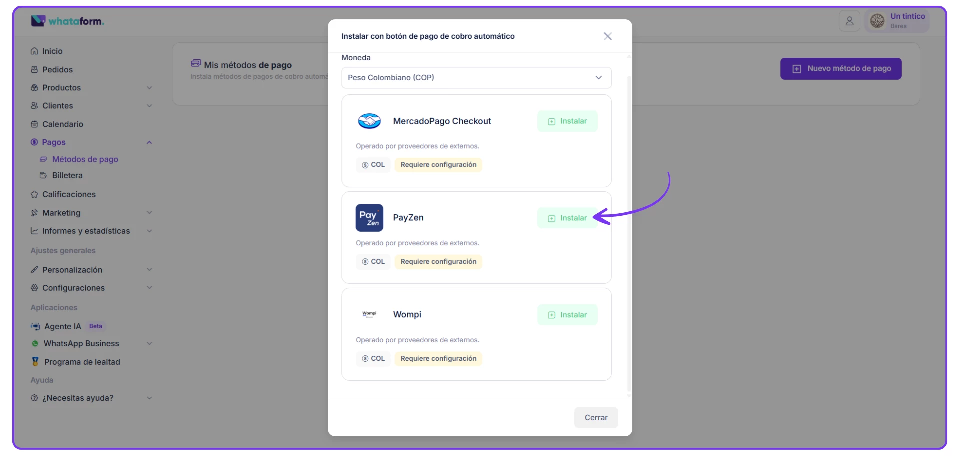 1) En tu panel principal de Whataform deberás ir en el menú lateral a la sección de "PAGOS" y seleccionar el módulo de “MÉTODOS DE PAGO”. Luego vas a dar clic en Nuevo método de pago y por último Instalar botón de pago.