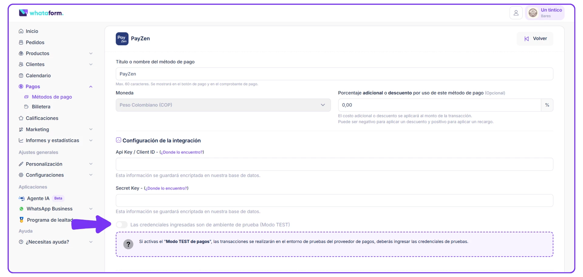 5) Si estás listo para avanzar con la integración en modo productivo, solo debes desactivar la opción del modo TEST y “GUARDAR CAMBIOS”.